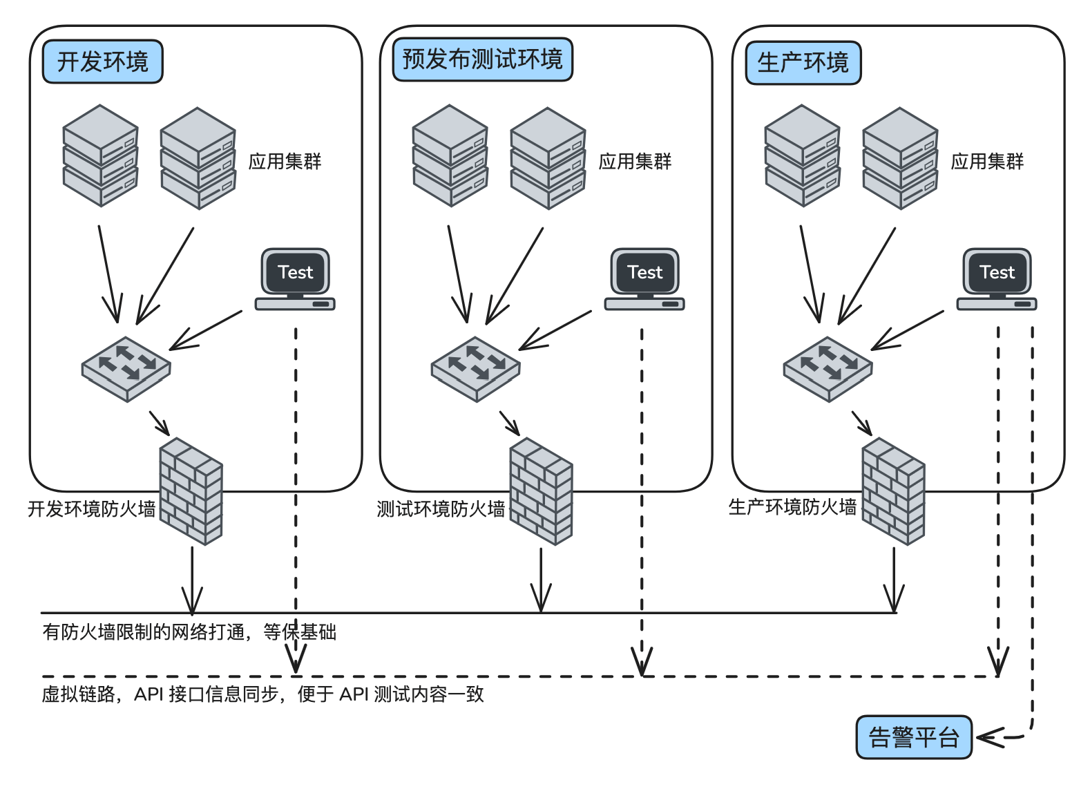 开发测试、预发布测试、生产测试环境三者互相独立,使用数据同步的方式,将 API 接口测试集合同步到各个环境,这样子质量管理部门只需要在开发测试环节调试好自动化 API 参数,等待业务正式上线时就可以直接应用上对应的 API 测试集合,极大提升测试工作效率。