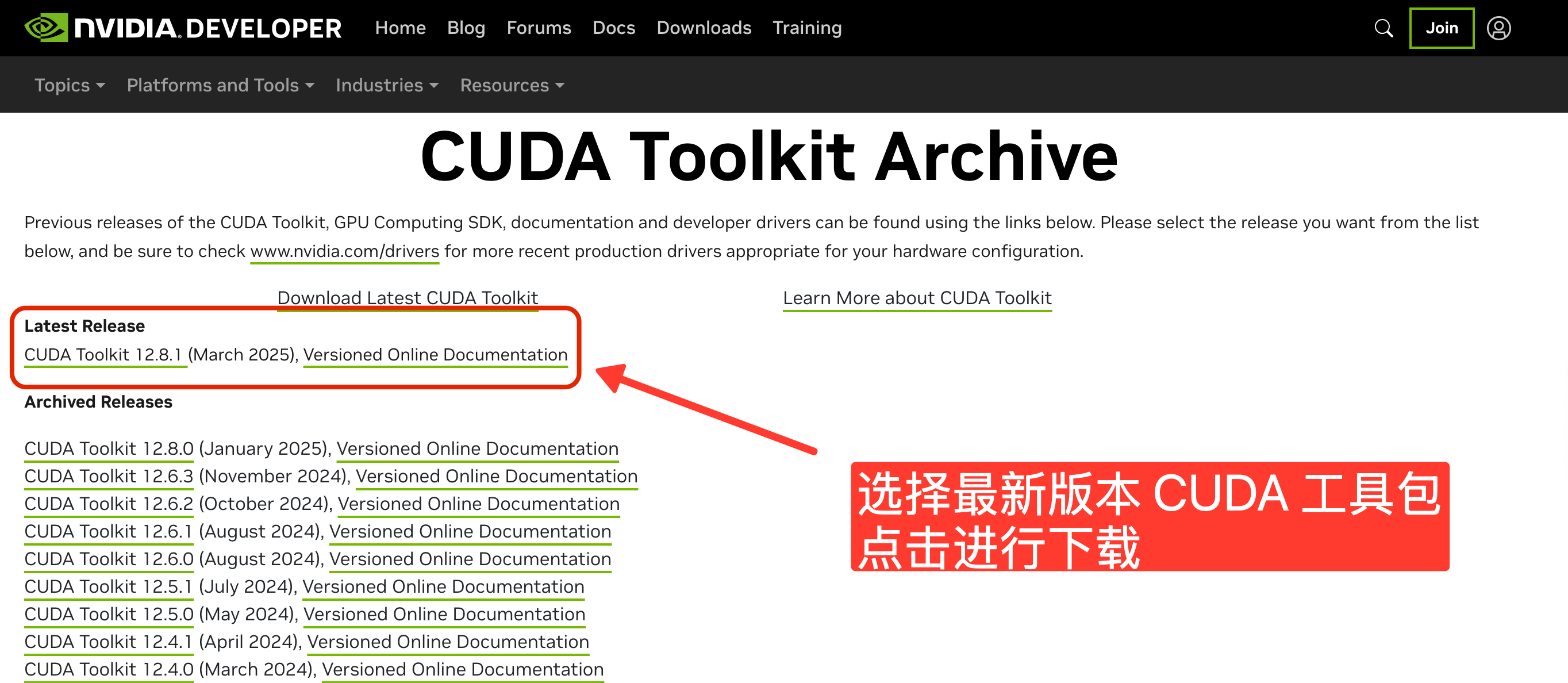 下载与驱动版本匹配的 CUDA 工具包安装文件,确保 CUDA 环境能够支持 GPU 加速。 下载地址https://developer.nvidia.com/cuda-toolkit-archive按需选择对应工具包